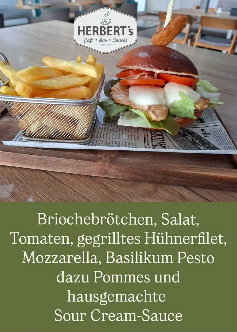 Sesambrötchen, Halloumi, gebratenes Gemüse, Zwiebel, Sour Cream Sauce und Pommes